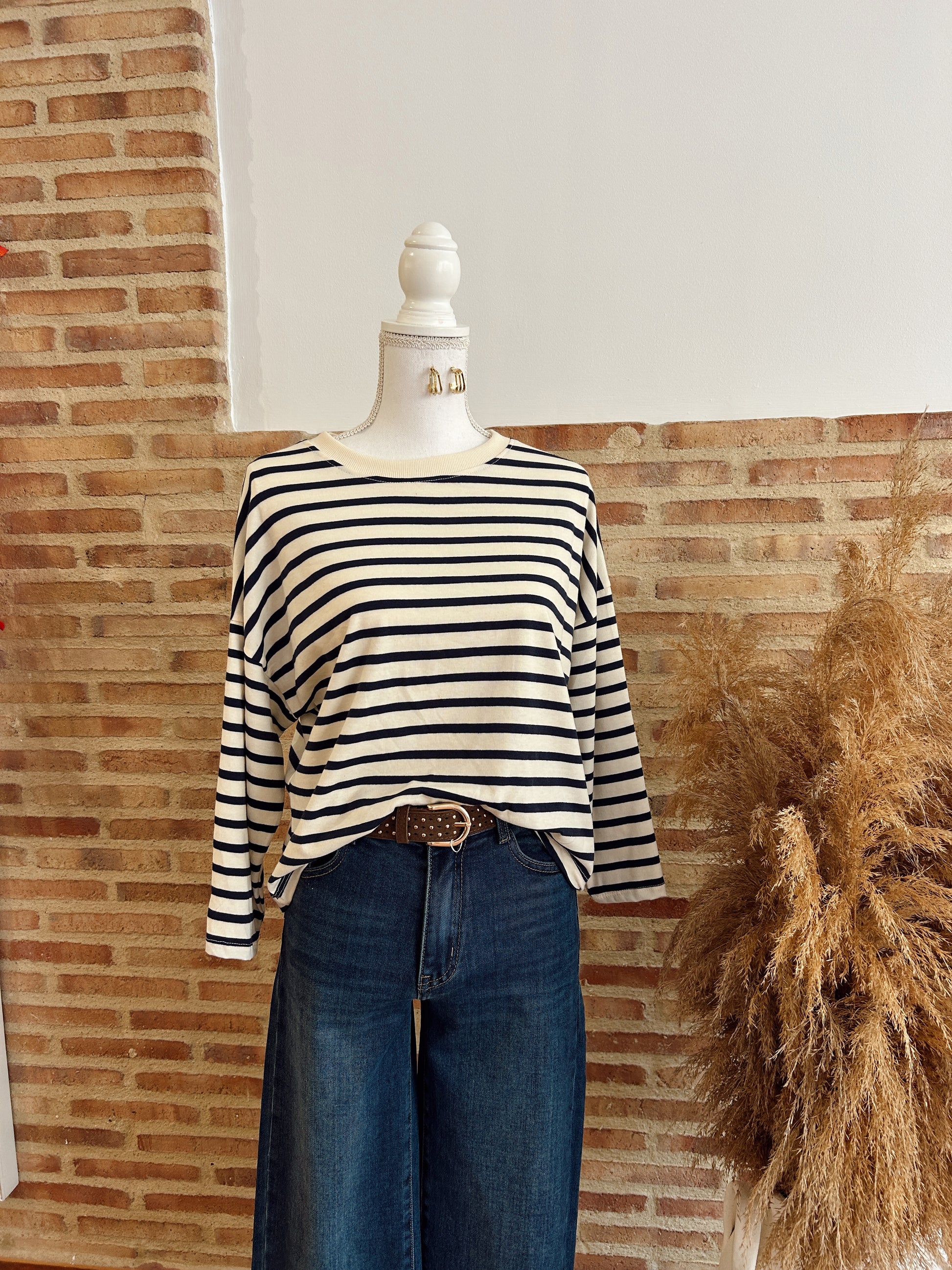 Esta camiseta de rayas te ofrece un estilo clásico y elegante para cualquier ocasión. Con su diseño en azul marino y beige, esta camiseta es perfecta para un look casual pero sofisticado. Hecha con materiales de alta calidad, esta camiseta es una excelente opción para cualquier guardarropa.
