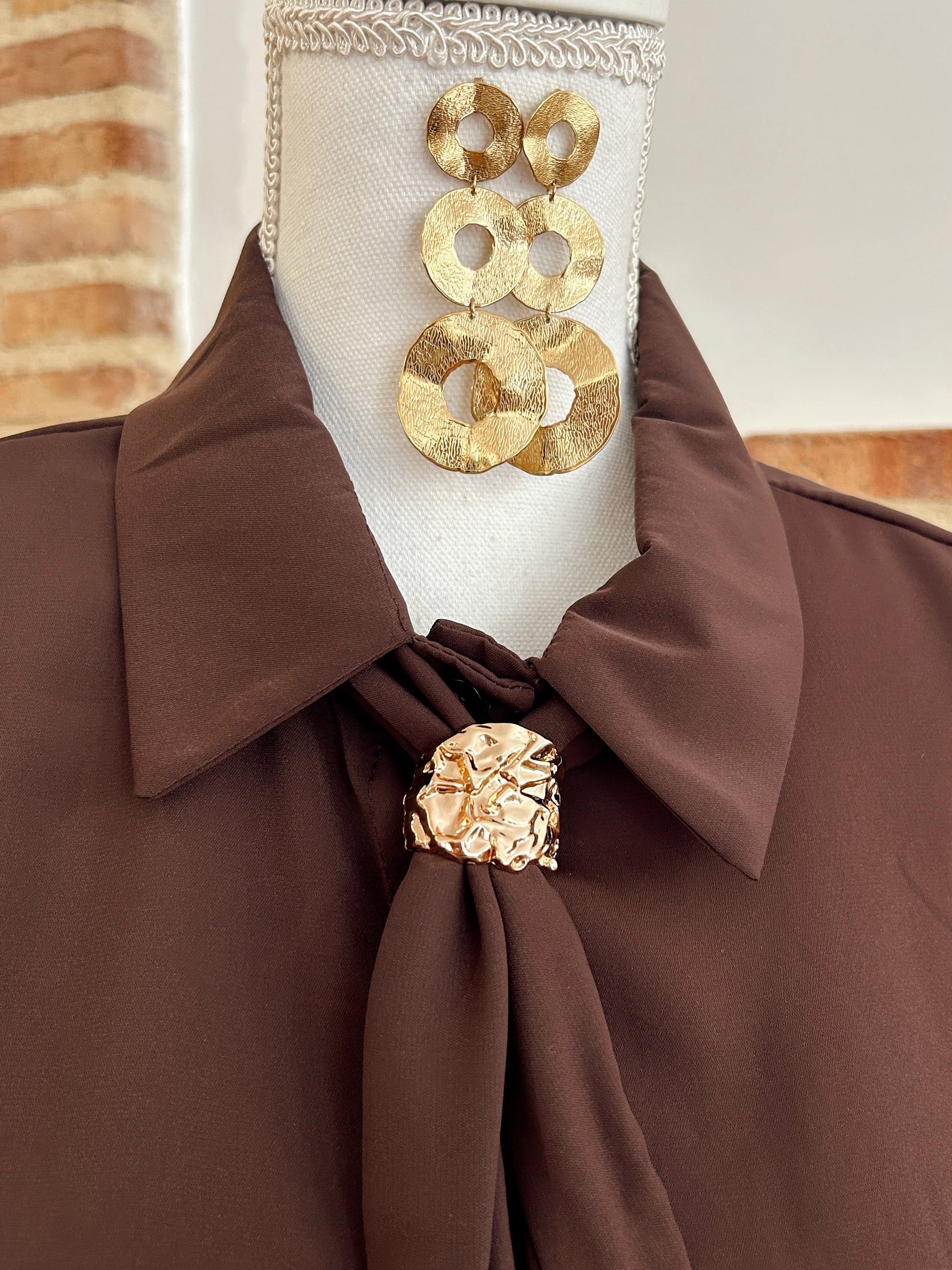 Camisa elegante con un diseño muy especial. Destaca por su cuello original, que se ata con una joya, creando un efecto similar al de una corbata, pero mucho más sofisticado y femenino. Una prenda con un toque diferente, ideal para looks arreglados o para dar un aire chic a un outfit más sencillo. Refinada, moderna y con muchísima personalidad.