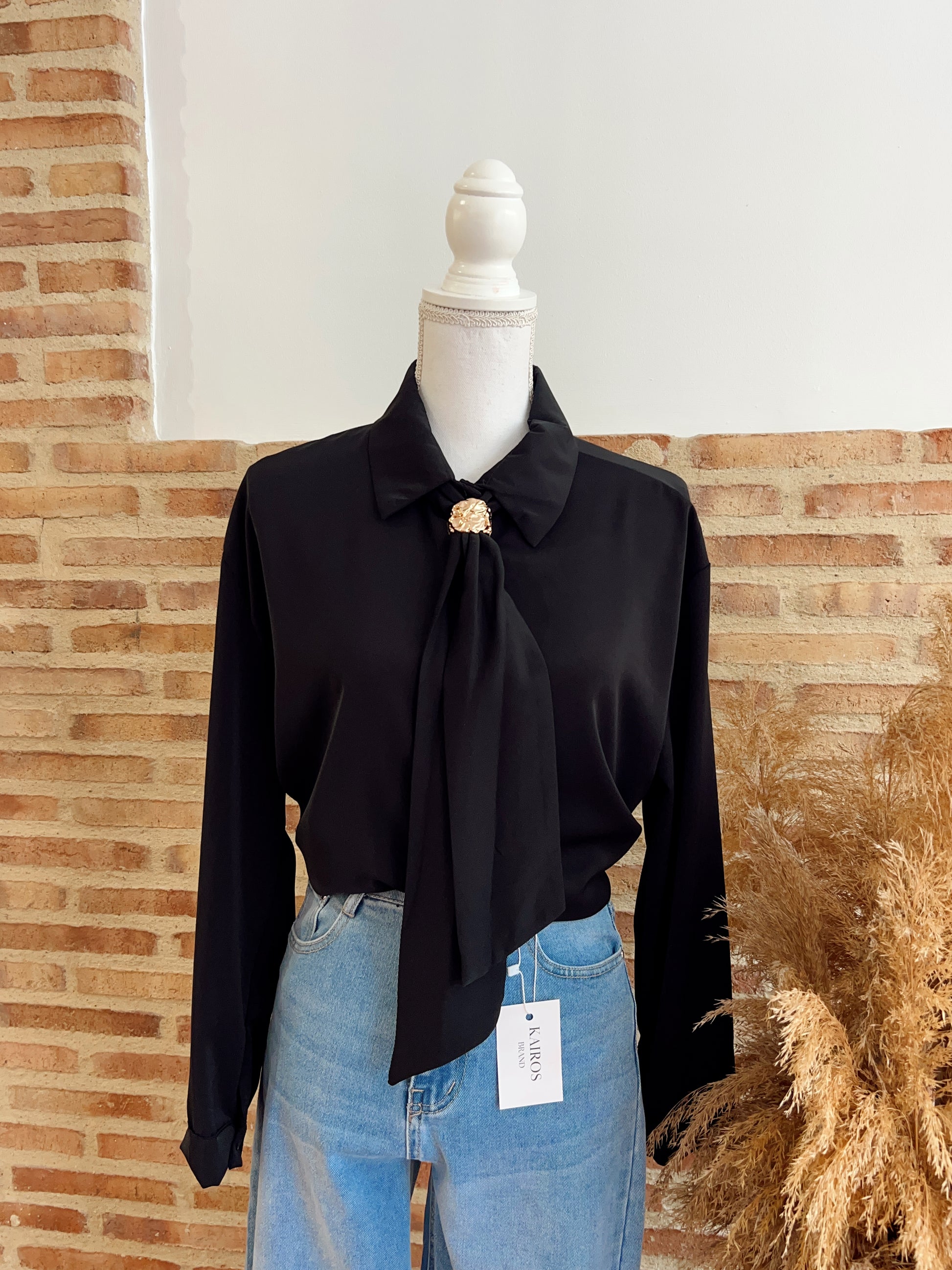 Camisa elegante con un diseño muy especial. Destaca por su cuello original, que se ata con una joya, creando un efecto similar al de una corbata, pero mucho más sofisticado y femenino. Una prenda con un toque diferente, ideal para looks arreglados o para dar un aire chic a un outfit más sencillo. Refinada, moderna y con muchísima personalidad.