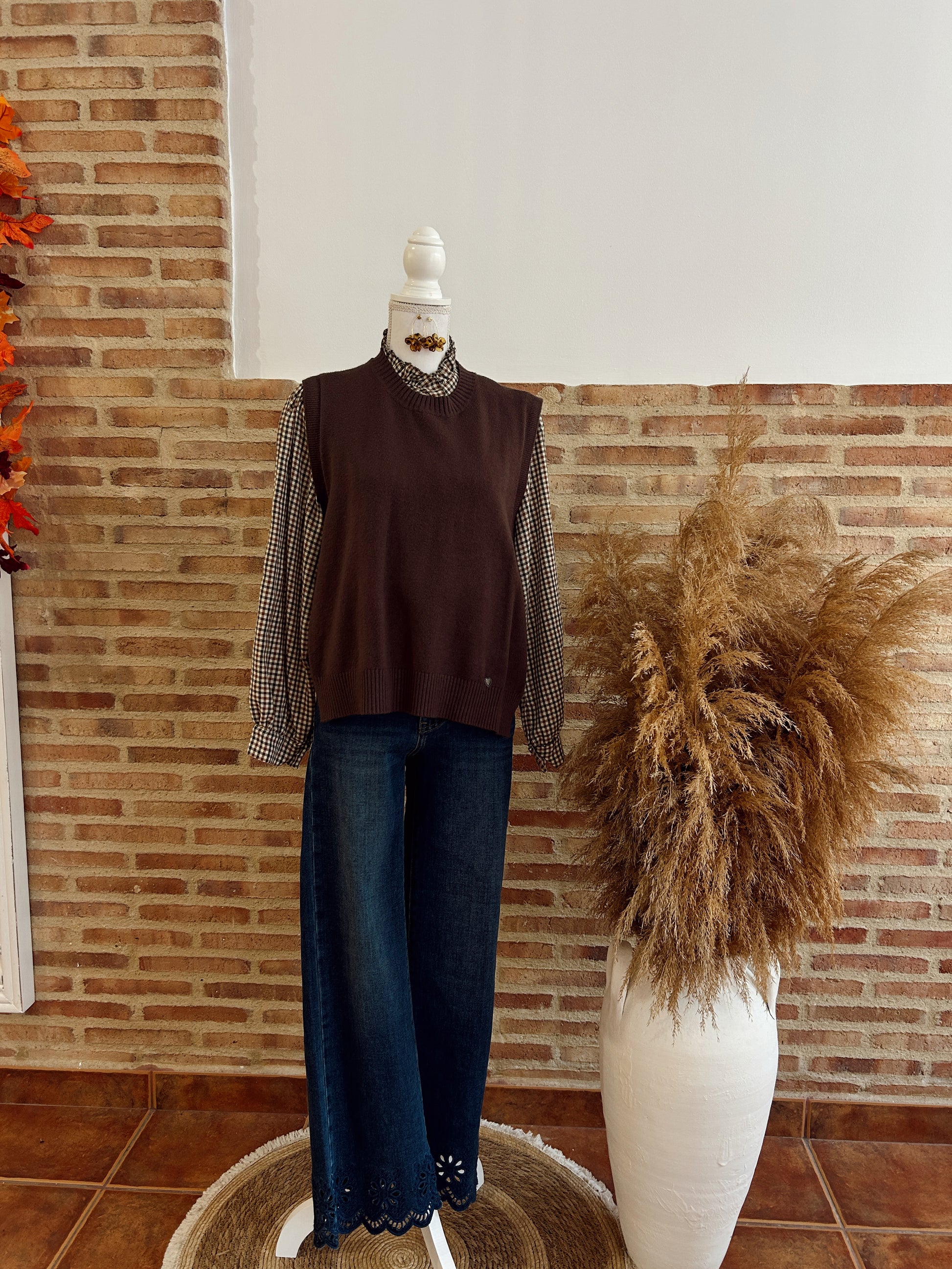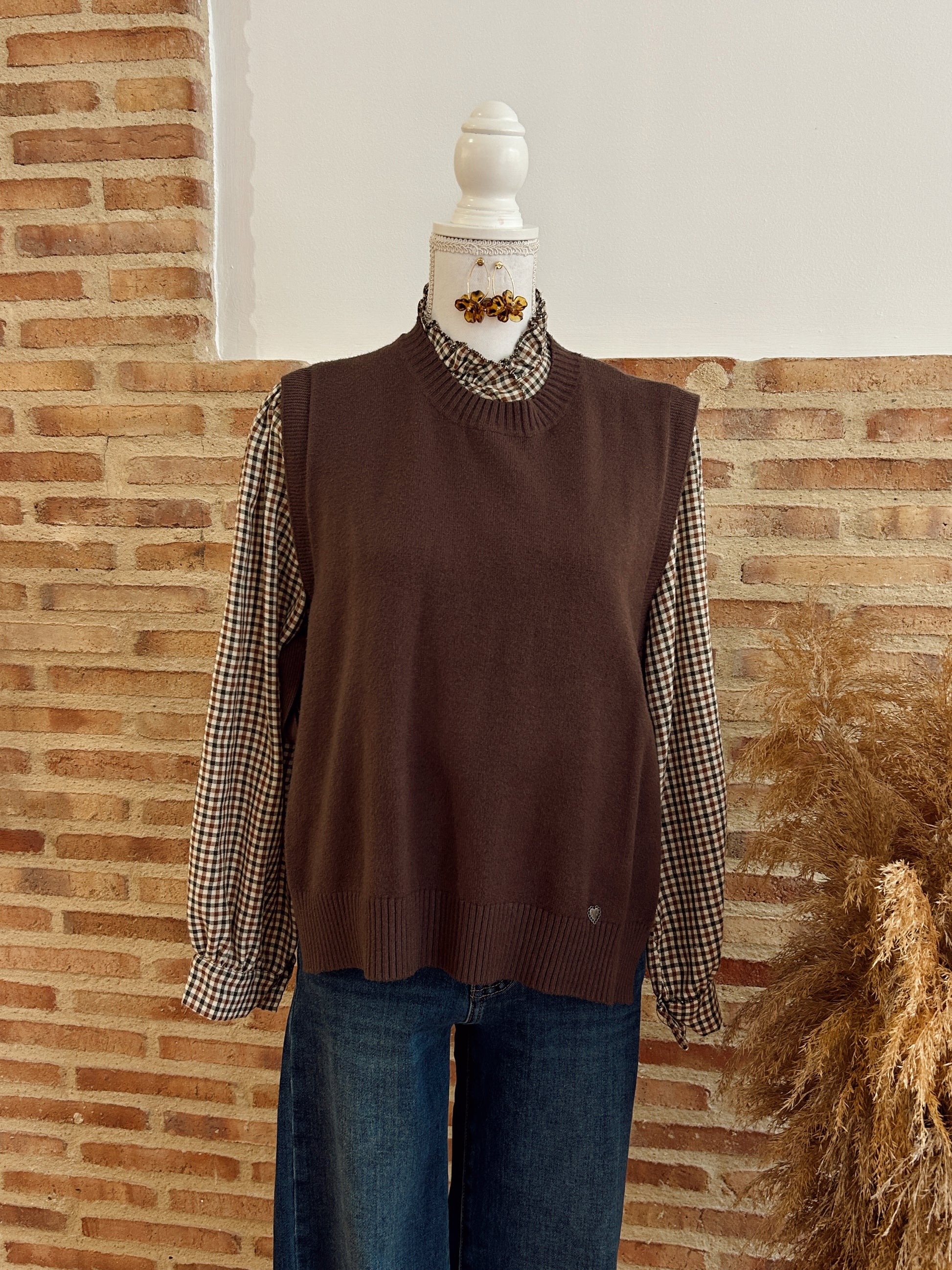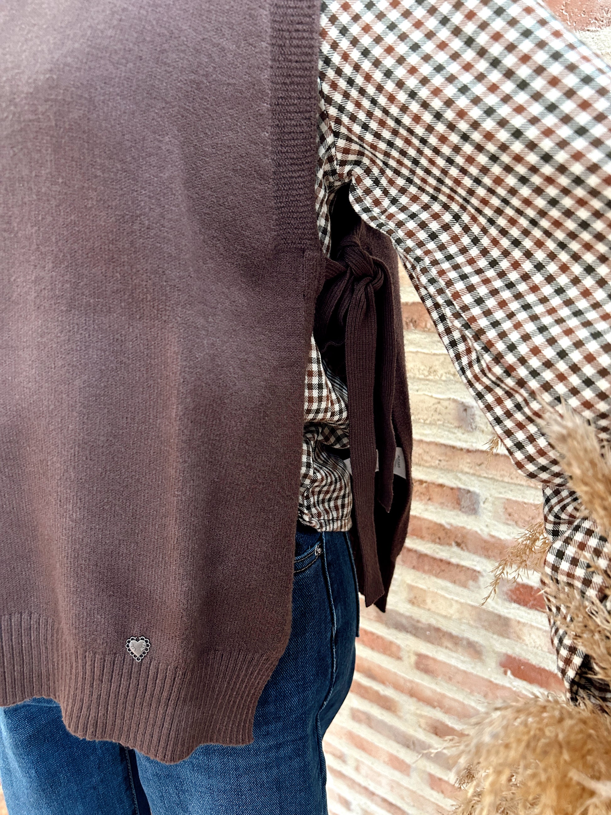 Chaleco marrón chocolate, con un diseño muy especial y favorecedor. Se ajusta por los lados con un lacito, permitiendo adaptarlo a tu figura y crear el fit perfecto. Ideal para combinar con camisas o blusas, aportando un toque elegante y actual a cualquier look. Una prenda versátil y con mucho estilo, perfecta para esta temporada.