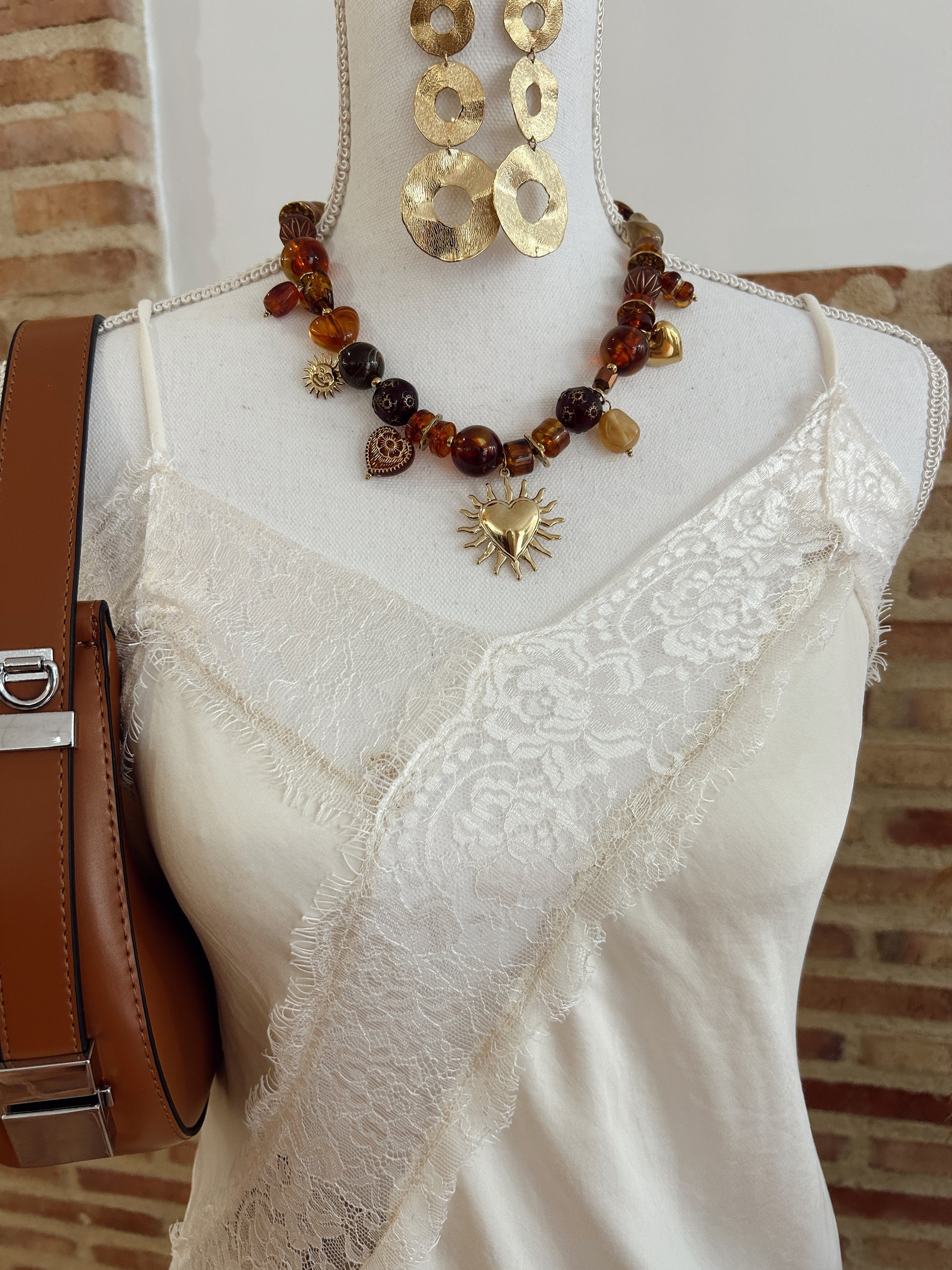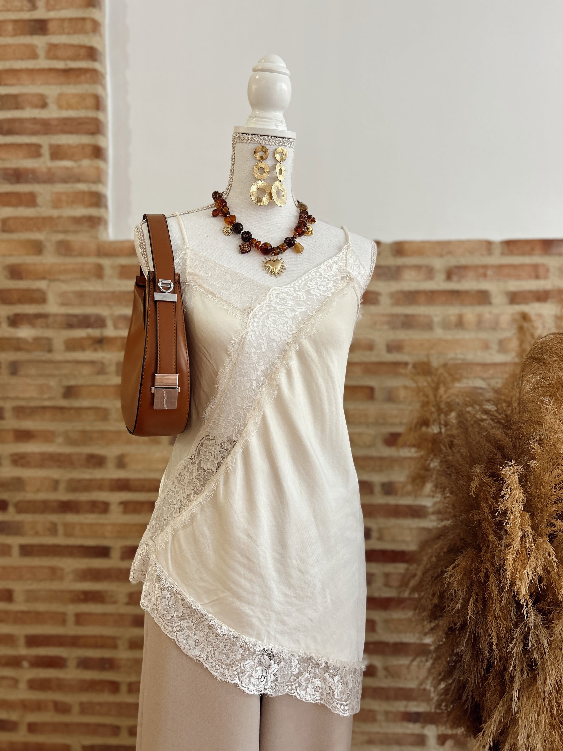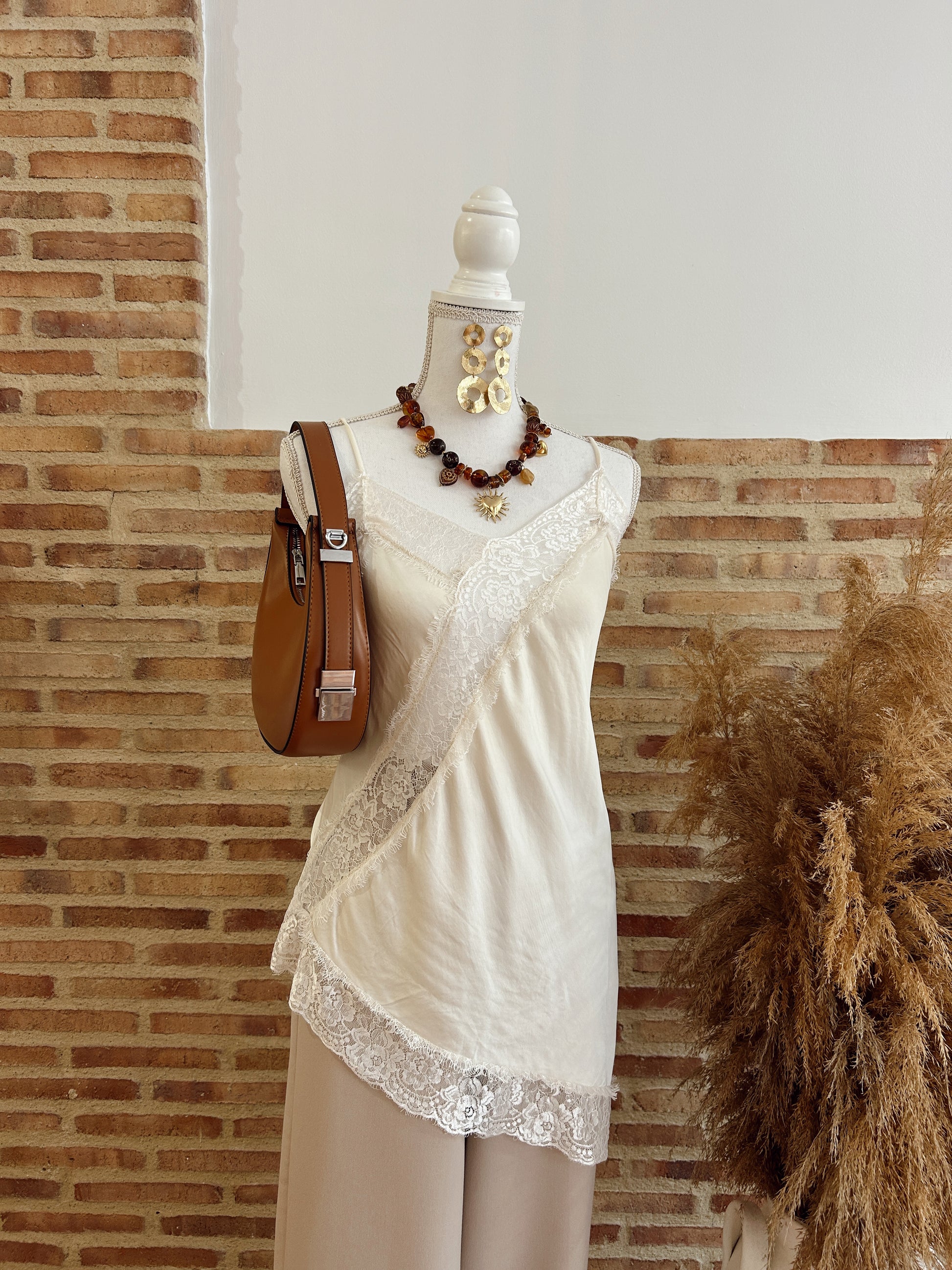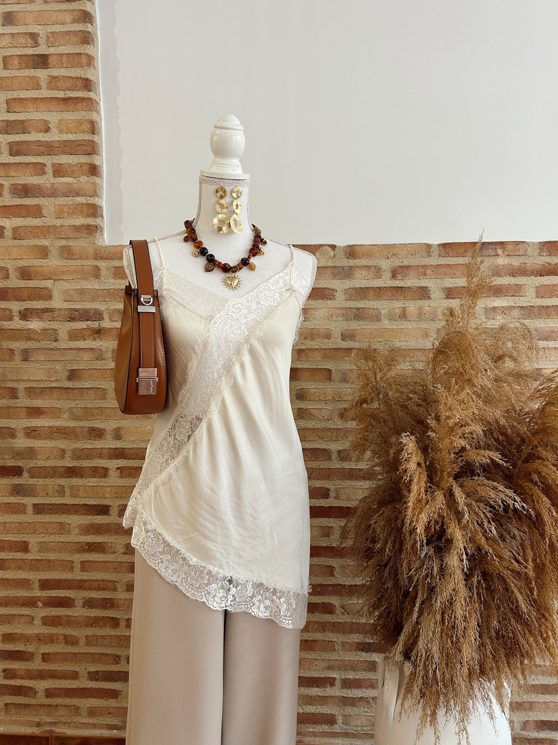 Top lencero de tendencia esta temporada, con acabados asimétricos que le dan un aire moderno y sofisticado. Es talla única, pero su diseño permite que quede perfecto desde la S hasta la L. Ideal para llevar arreglado con una blazer o, de manera más casual, bajo un jersey dejando asomar su delicado encaje, tan protagonista este otoño-invierno 25/26. Una prenda versátil y elegante que aporta un toque femenino y actual a cualquier look.